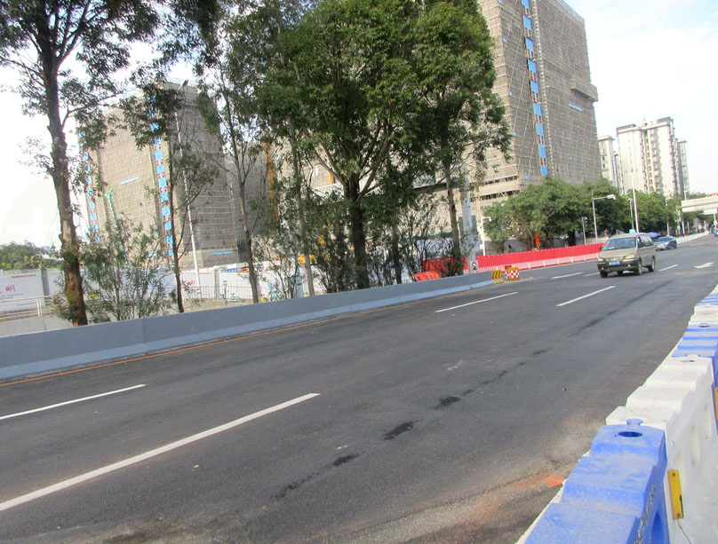 北区中环出生物岛隧道原先临时凿建的引入坡道,已经完全恢复中环道路原状,路边低矮围栏墙也是修筑一新,看着是舒服多了