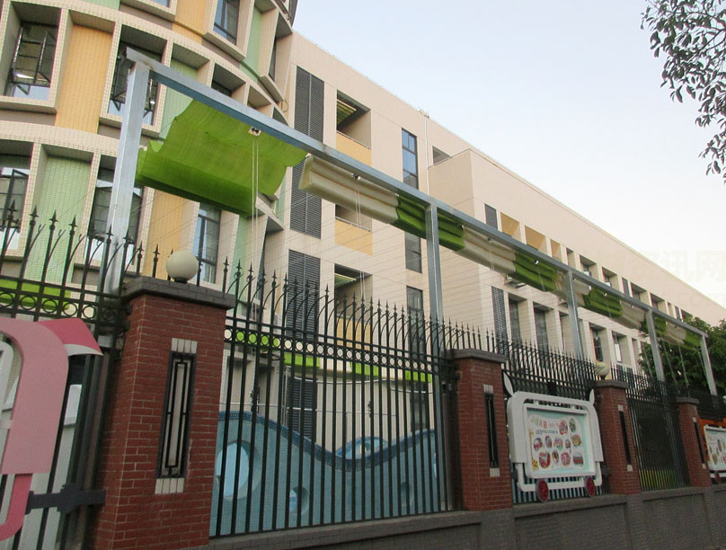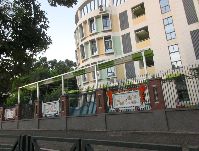 | 大学城幼儿园西北角西侧先前看到的沿墙边焊立的支架 是此区域活动场池的露天挡风遮雨挡阳光的可开可拉合挡雨棚布之用 | ||||||
