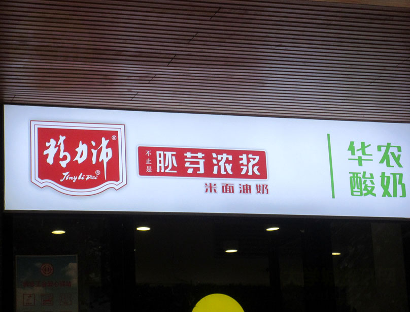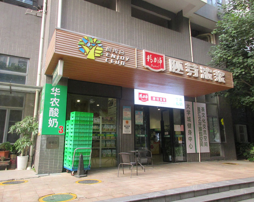华农酸奶店正门入口上檐似还新装了一个广告灯箱,米面油奶都有卖的说