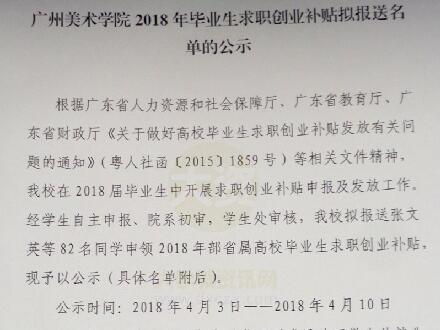 广州美术学院2018年毕业生求职创业补贴拟报送名单公示
