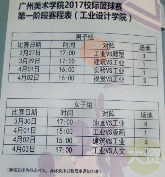| 广美2017校际篮球赛之工业设计学院第一阶段赛程表 | ||||||
