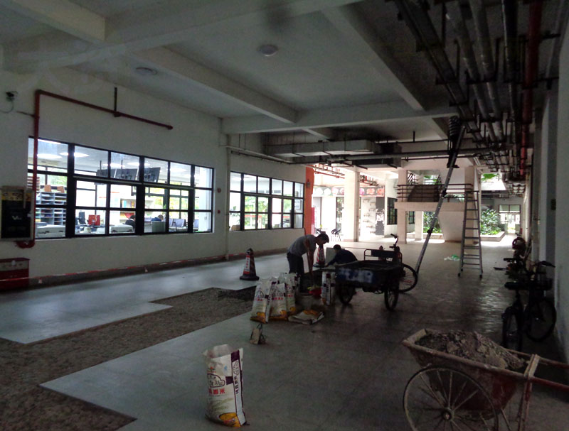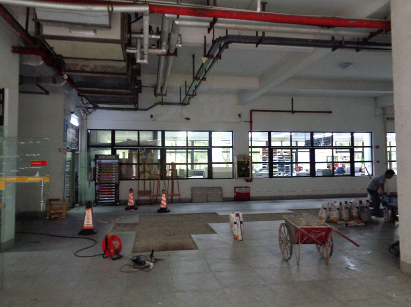 | 生活区宿舍1栋一楼架空层东侧正在更换修复地板砖 | ||||||