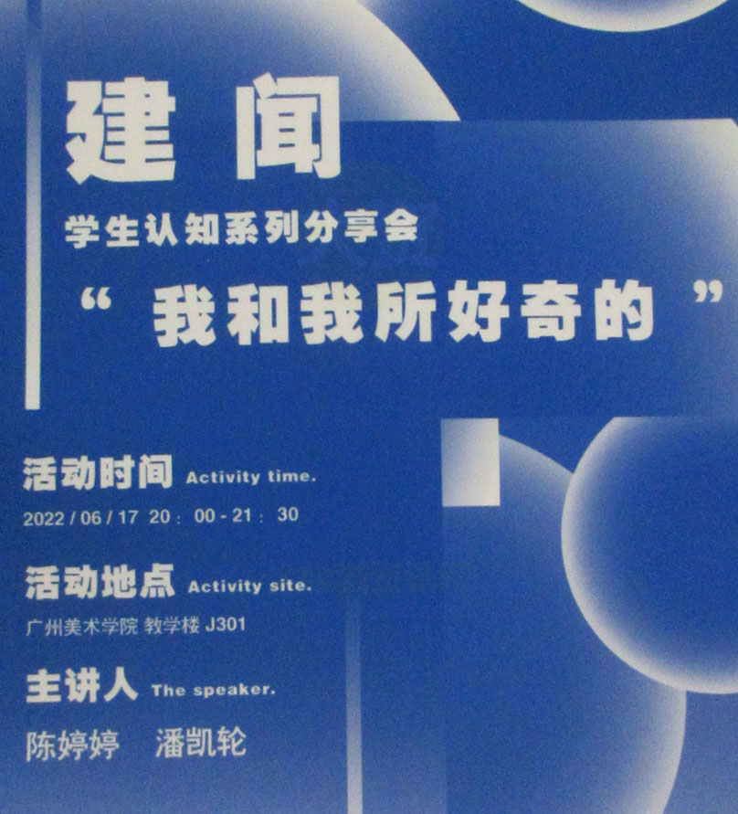 | 广美·建闻“我和我所好奇的”学生认知系列分享会 2022.06.17晚8点-9点半 教学楼J301 主讲陈婷婷&潘凯轮 | ||||||