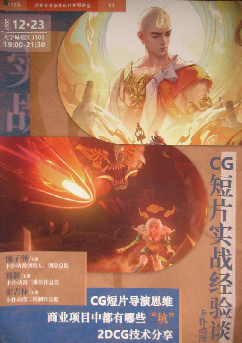 | 2022级动画专业毕业设计专题讲座 CG短片实战经验谈 2021.12.23 教学区J103晚上19点-21点30分 | ||||||