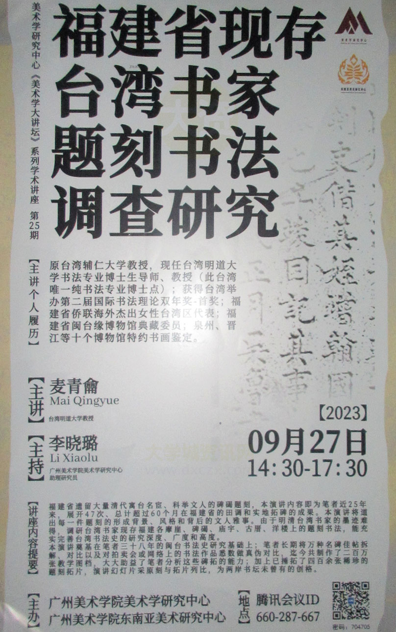 福建省现存台湾书家题刻书法调查研究讲座 2023.09月27日下午14点30-17点30 主讲人-麦青龠 |