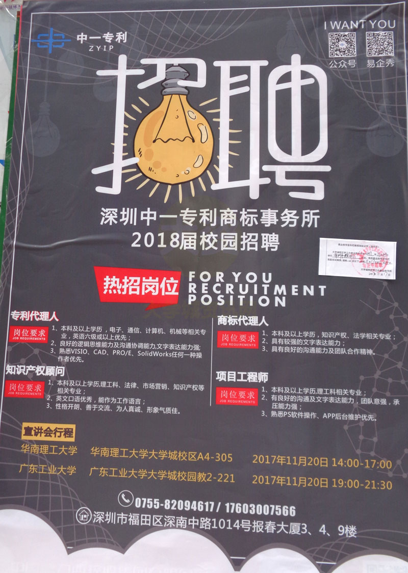 | 深圳中一专利商标事务所2018届校园招聘 | ||||||