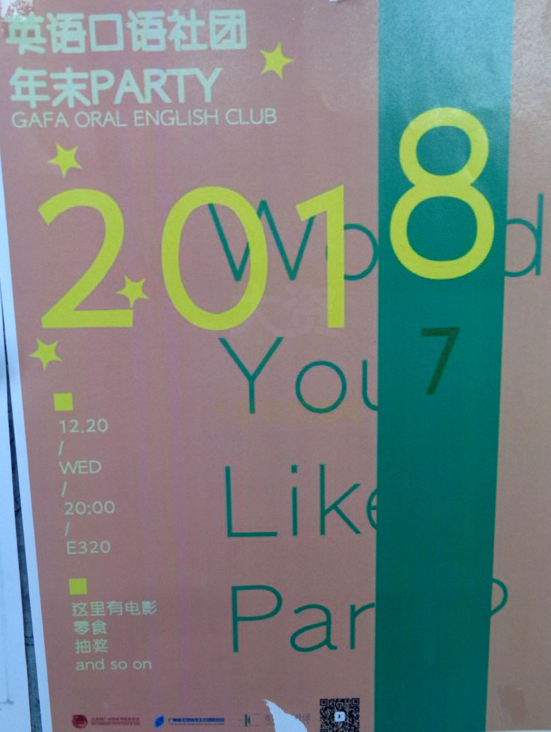 | 英语口语社团年末PARTY 12.20/WED/20:00/E320 这里有电影零食抽奖and so on | ||||||
