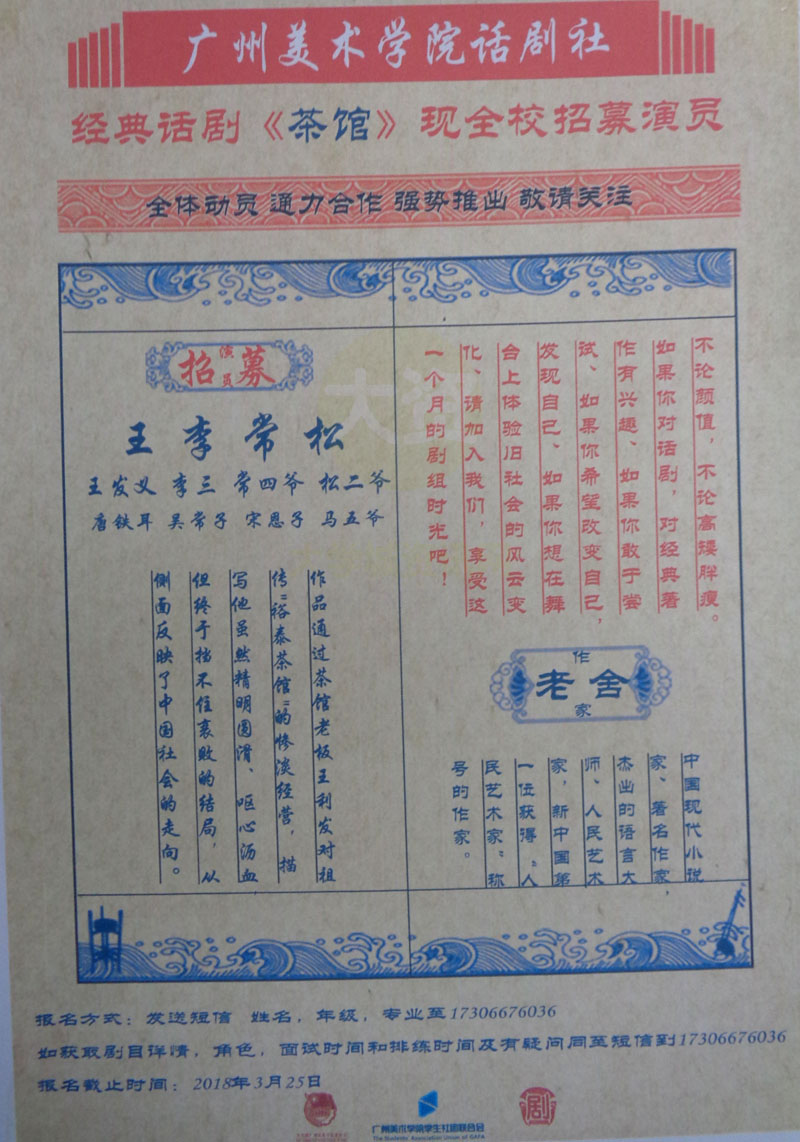 | 广州美术学院话剧社经典话剧《茶馆》现全校招募演员 截止报名3月25日 | ||||||