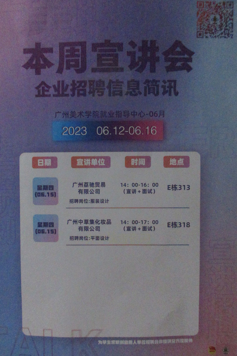 广州荔驰贸易有限公司宣讲会 招聘岗位-服装设计 2023.06.15周四下午14点-16点 宣讲+面试 教学区E栋313 广州中草集化妆品有限公司 招聘岗位-平面设计 2023.06.15周四下午14点-17点 宣讲+面试 教学区E栋318 |