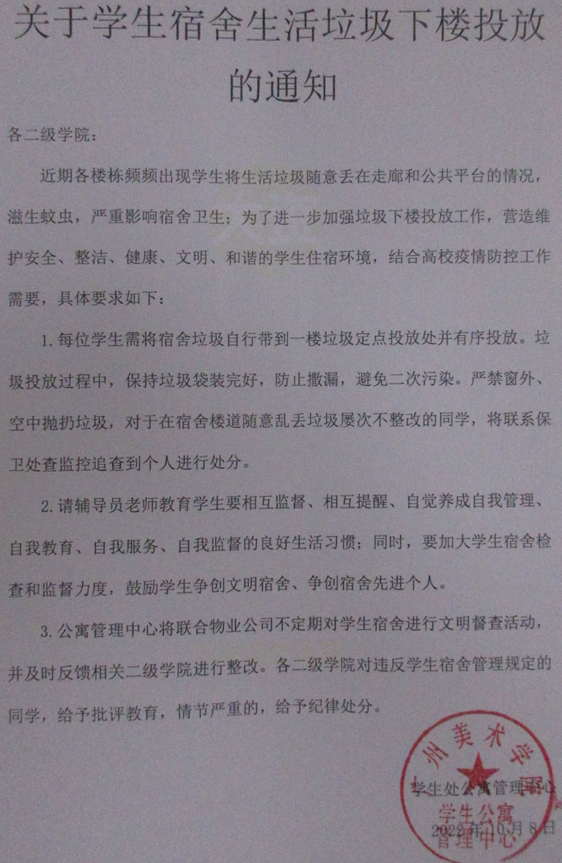 学生公寓管理中心·生活区各栋学生宿舍生活垃圾下楼投放通知 |
