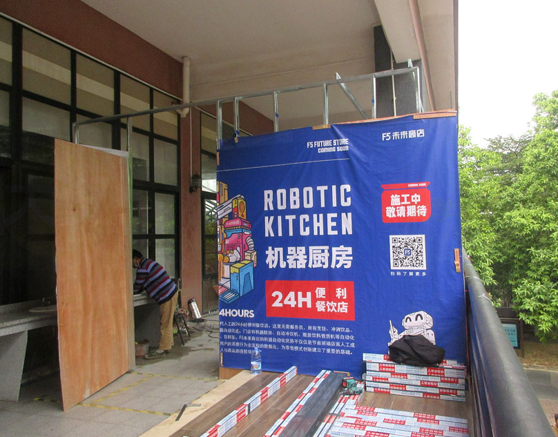 | 广美饭堂二楼正门北侧看到好像在装修一个叫什么机器厨房的24小时餐饮便利店 细看原来又是F5未来商店 | ||||||