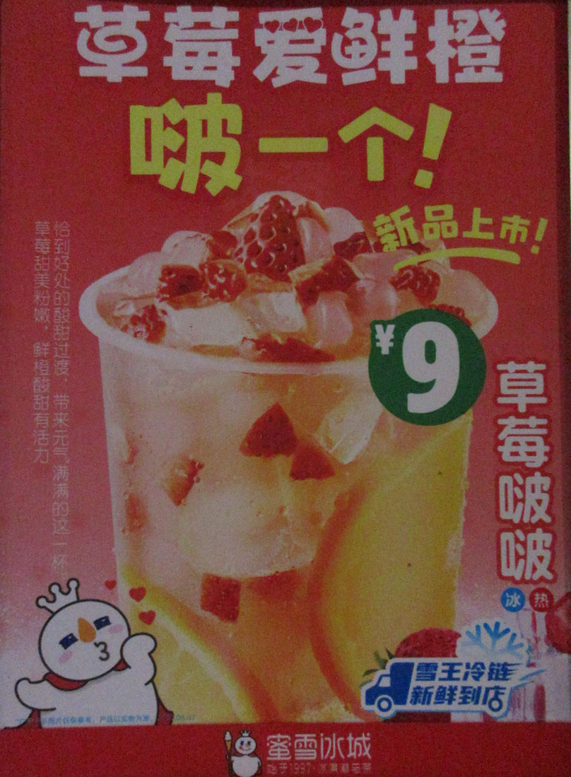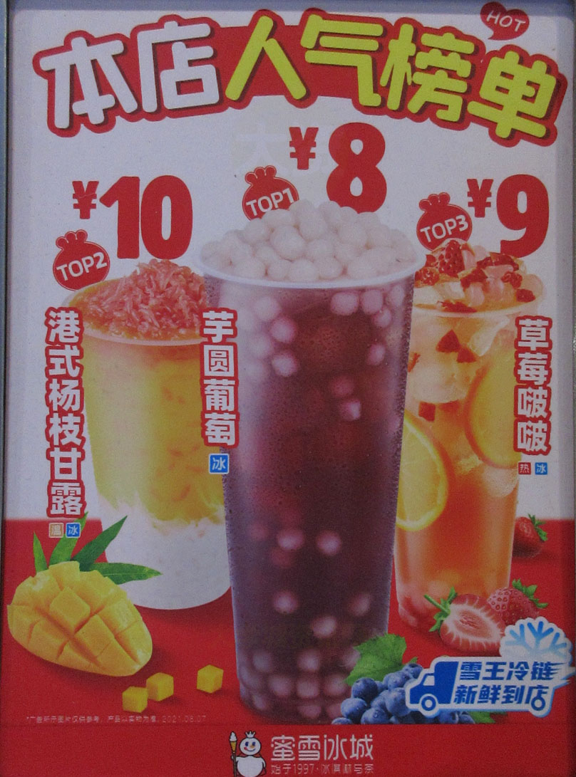 | 广美饭堂一楼正门入南侧 蜜雪冰城 本店近期人气榜单 TOP1-芋圆葡萄8元 TOP2-港式杨枝甘露10元 TOP3-草莓啵啵9元 | ||||||