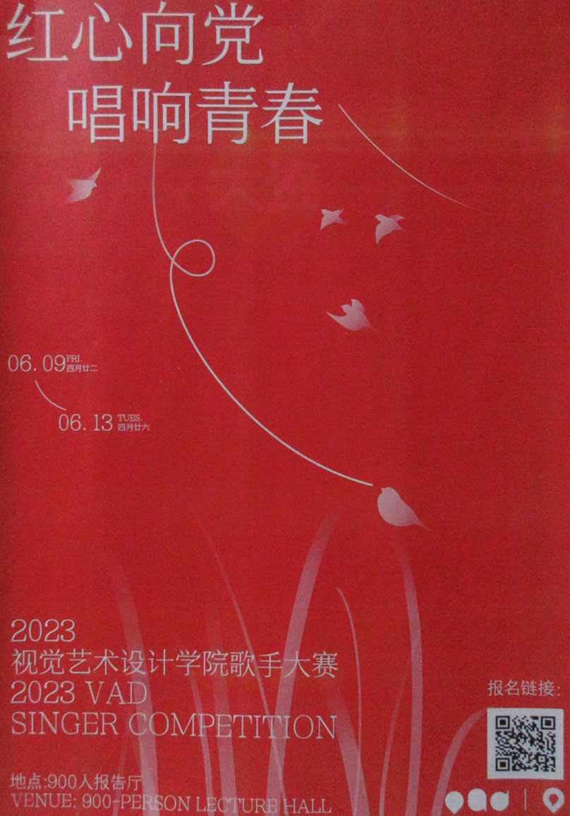 | 红心向党,唱响青春-2023视觉学院歌手大赛 扫码报名06.09-06.13 900报告厅 | ||||||