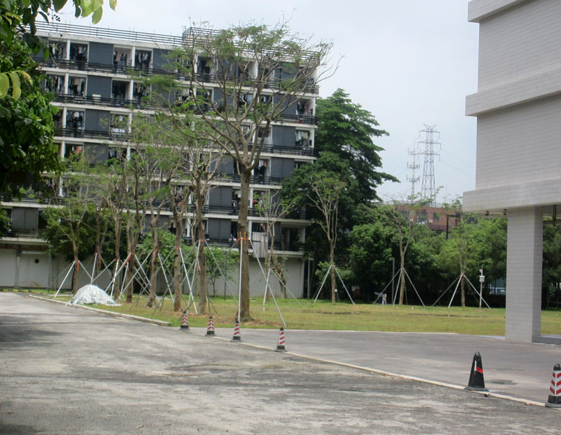 | 广美生活区新增建宿舍楼前面空地,继铺植草皮后,最新看到还围种了一列树木 | ||||||