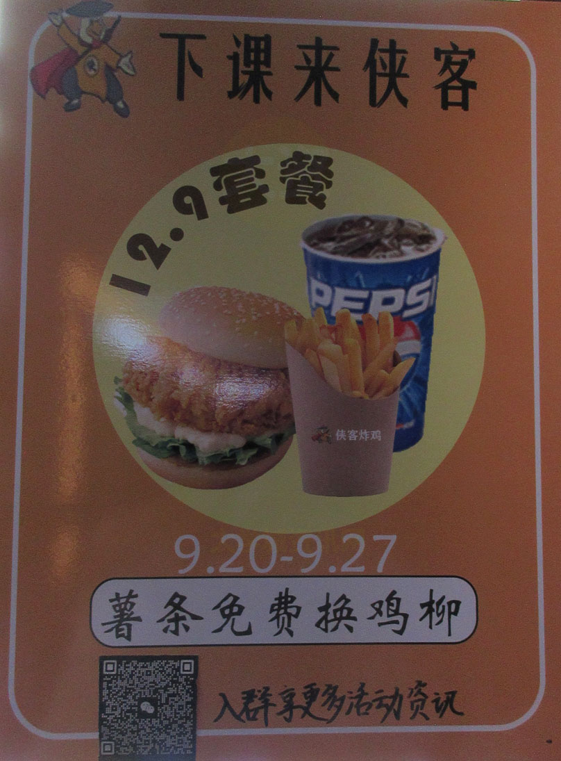 广美饭堂二楼外北侧 侠客炸鸡汉堡 12.9元超值套餐 9.20-9.27期间薯条可免费换鸡柳