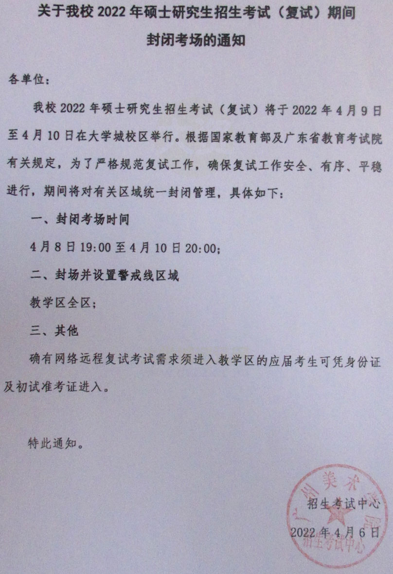 | 广美 2022年硕士研究生招生考试(复试)期间封闭考场(教学区)通知 | ||||||
