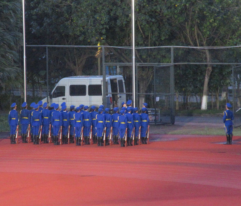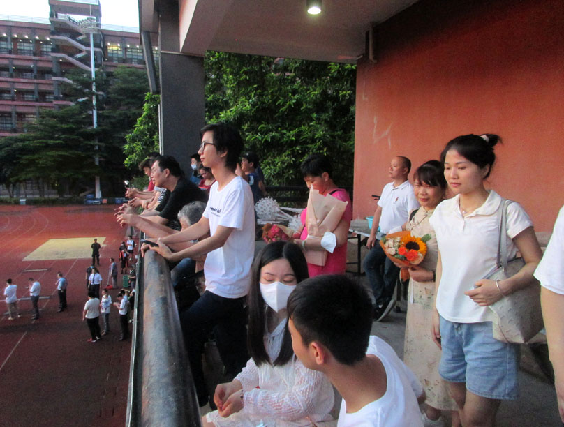 广州美术学院2022届学生毕业典礼 印象中,也是这么多年来,第一次破天荒地选择在晚上(傍晚时分)和选择在室外露天环境来进行 场内场外都挺热闹的,除了毕业生,其它观看的人也不少些,尤其教学楼C栋西侧朝田径场廊台,这其中,也可见应该是一些部分毕业生的家长or亲戚朋友,挨着围栏,这在这近两年多来,已算是稀有场面了 典礼开始的时间,已是在傍晚的7点,尽管白天太阳很暴晒,这个时候,阳光的余热已经客气很多了,想必这也是典礼选在户外的前提下而又专门定在晚间的挺大原因 典礼开场前,先来了两个暖场或者说带动气氛的节目表演,首先是一个广美的校级啦啦操,伴随着舞动的音乐节奏,场面瞬间就欢快起来了,接着是男女合唱了一曲,听着也还可以 接着典礼算是正式开始,一如既往地,广美这几年比较大型的活动,基本都是由副院长蔡拥华教授主持,蔡院长的发型本身就很有风格特点,辨识度相当高,在广美也可说是独树一帜的,加上带着学士帽,同学们看到,都不由得发出一阵会心欢笑,非常喜乐 首先,升国旗仪式,看到,广美国旗护卫队,着装上也有了最新的统一配备,颜色外观远看就醒目又不失庄重