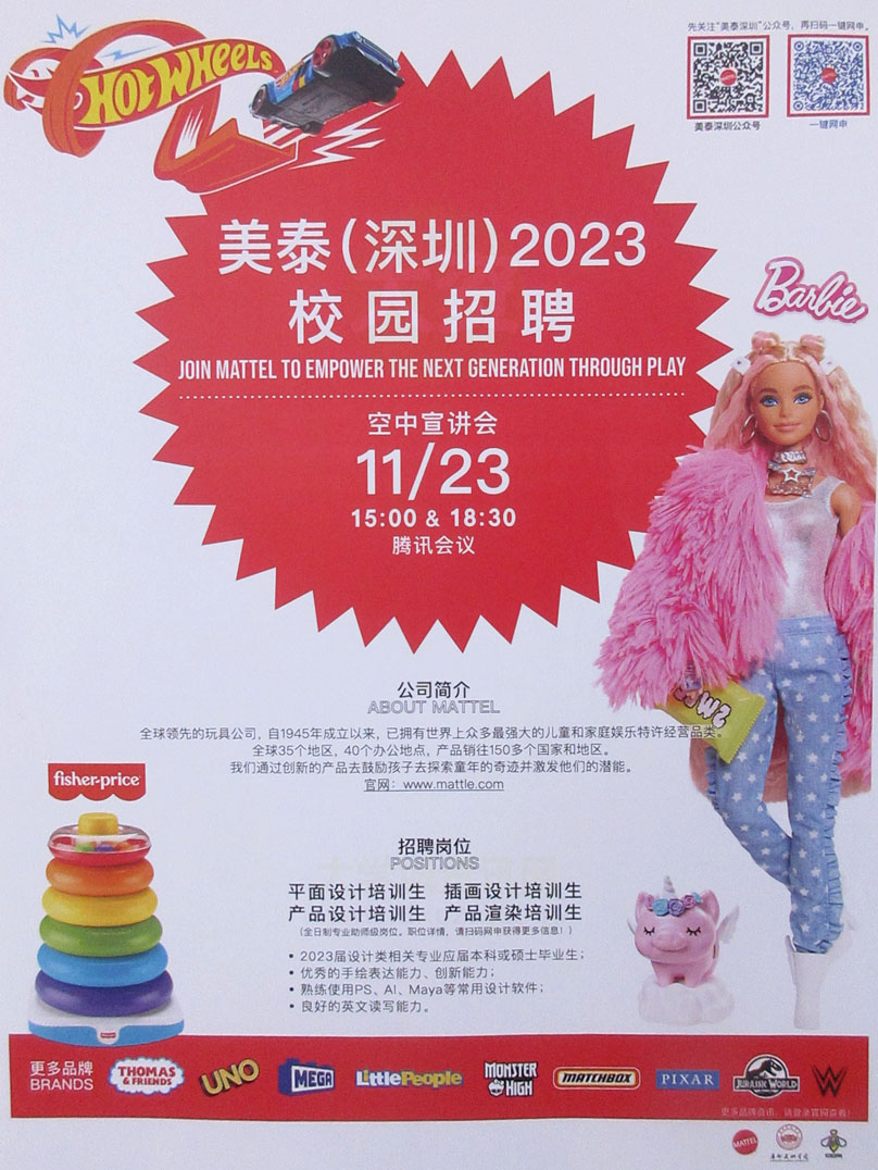 美泰(深圳)2023校园招聘 空中宣讲会11.23周三下午15点-18点30 线上参与 招聘岗位:平面&插画&产品设计培训生,产品渲染培训生