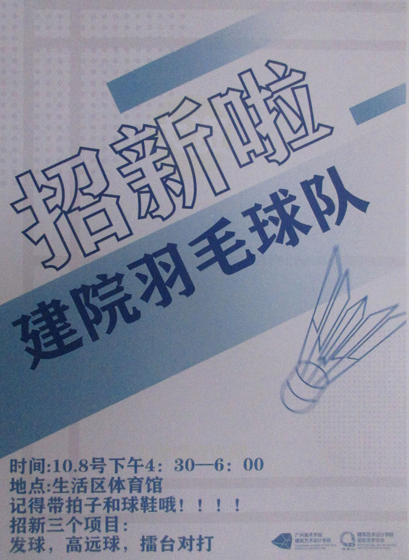 | 广美·建筑学院羽毛球队招新 2022.10.08周六下午4点半-6点 生活区体育馆 | ||||||