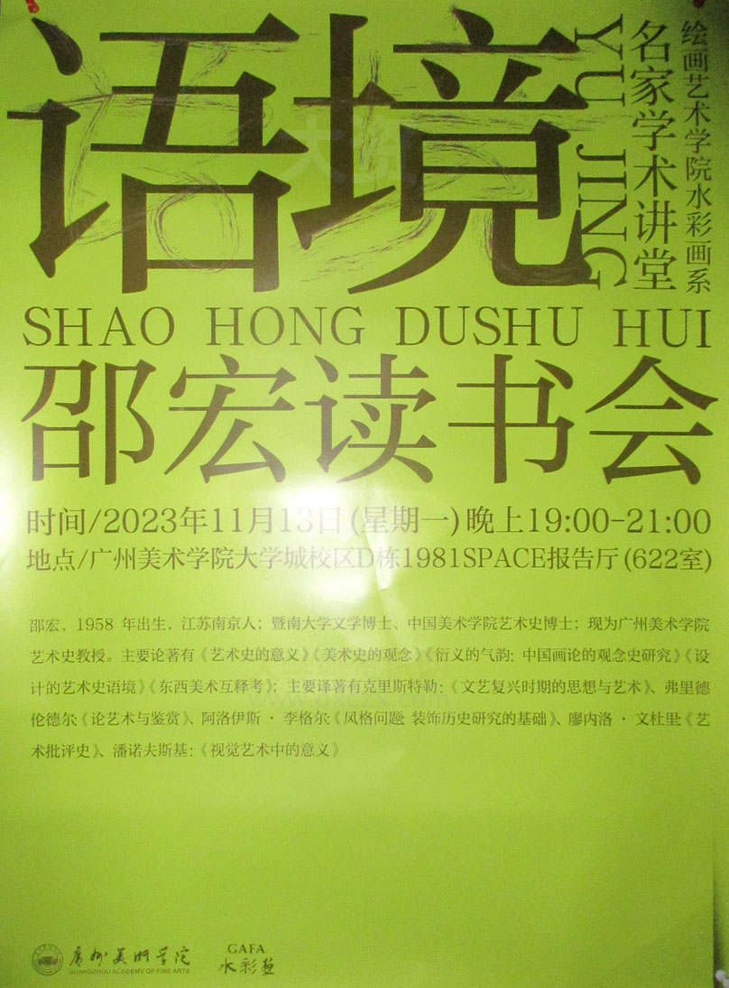 绘画艺术学院水彩画系-名家学术讲堂 语境·邵宏读书会 2023.11.13周一晚19点-21点 教学区D栋 1981SPACE报告厅-622室 |