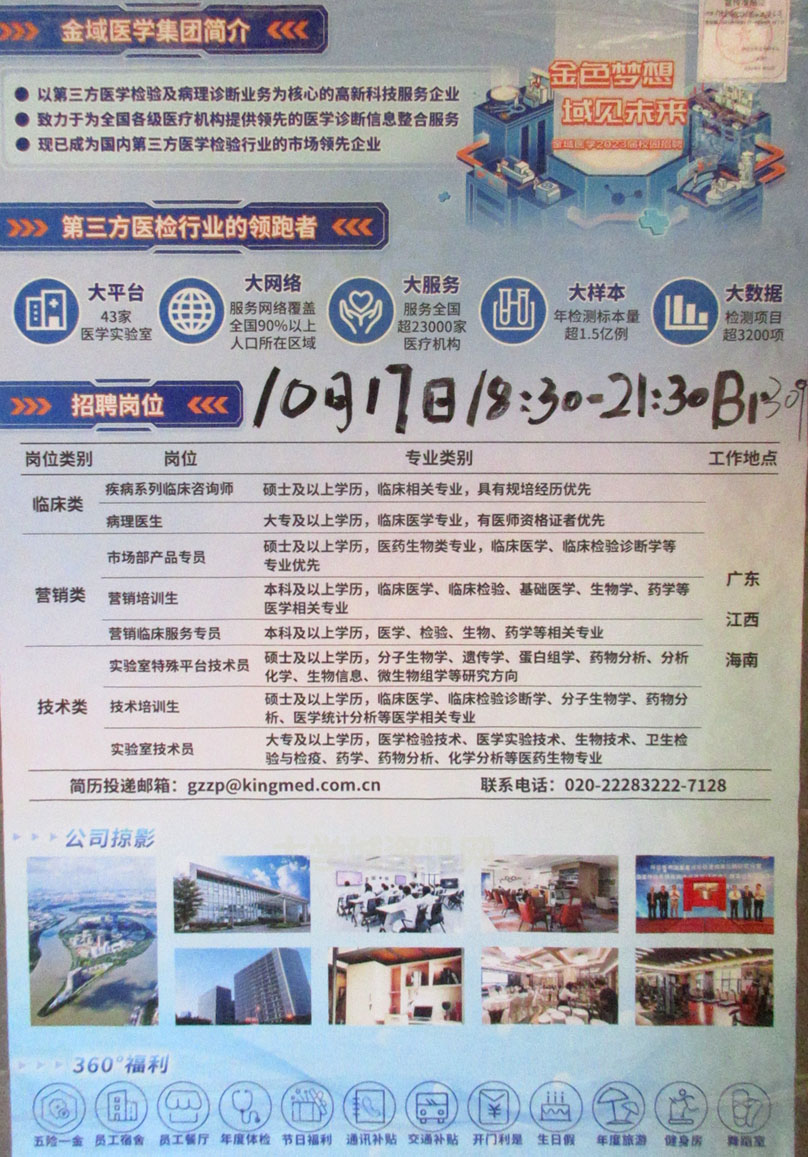 金域医学集团2023校园招聘宣讲会 10月17日傍晚18点30分-21点30分 教学区B1-309 |