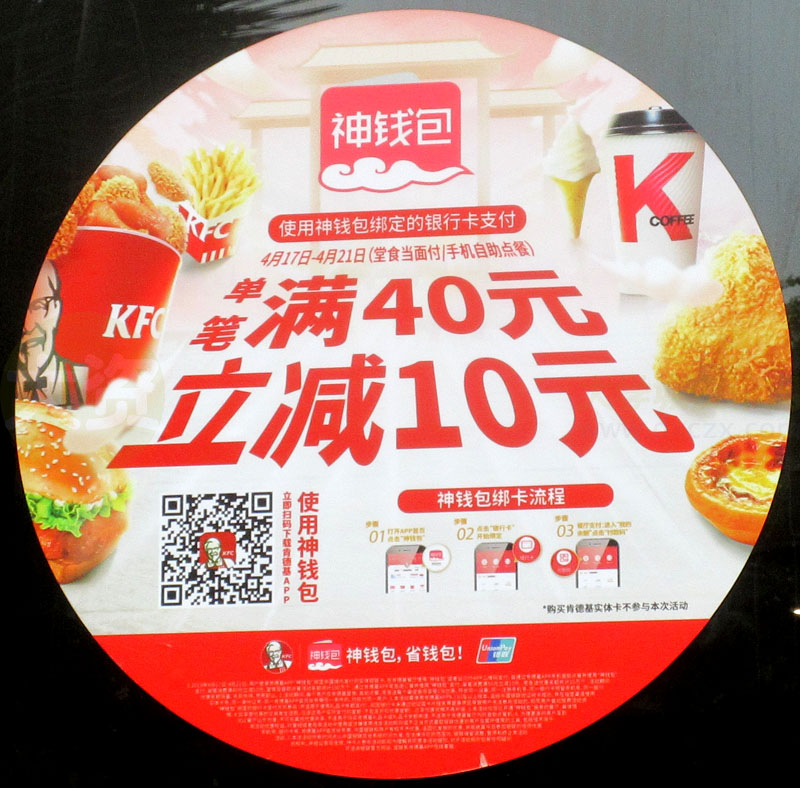 用这个神钱包,是有购满优惠的,不过有期限的,目前看到说就是短短的5天,4月17至4月21日。这个神钱包,应该跟银联有些关系,可能是银联和KFC方面的一个合作