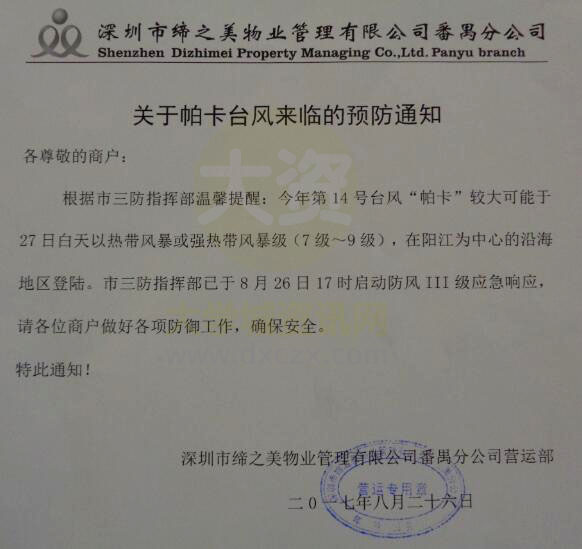 | 关于帕卡台风来临的预防通知(缔之美物业20170826) | ||||||