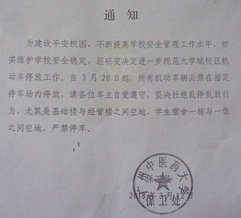 [通知]自3月20日起所有机动车辆必须在指定停车场内停放