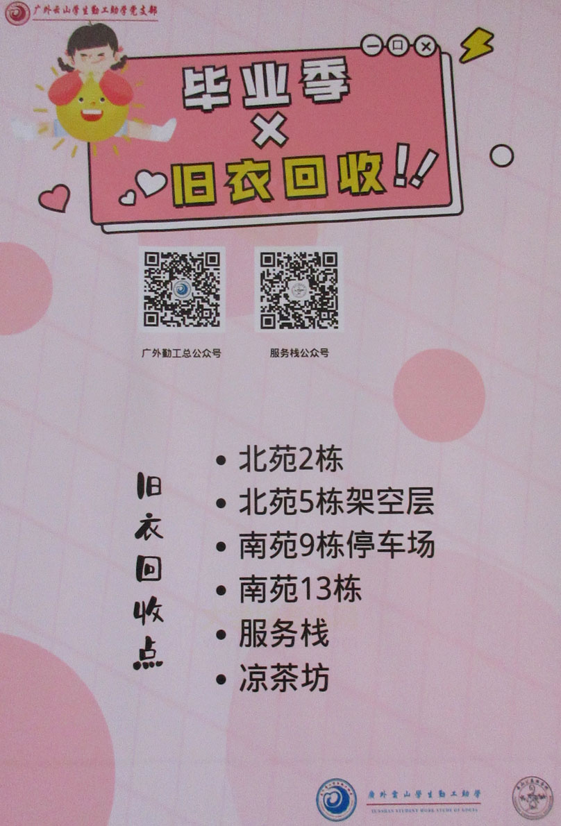 | 毕业季旧衣回收正在进行&北苑2栋 北苑5栋架空层 南苑9栋停车场 南苑13栋 公益服务栈 云山凉茶坊 | ||||||