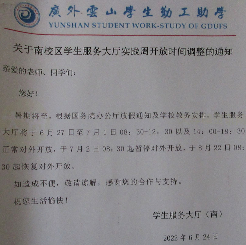 教学区A栋-学生服务大厅实践周开放时间调整及暑假期间暂停开放时段通知
