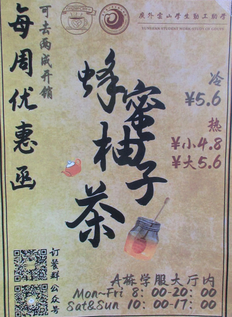 | 广外教学区A栋学生服务大厅内 每周优惠 蜂蜜柚子茶冷5.6元 热小4.8元大5.6元 | ||||||