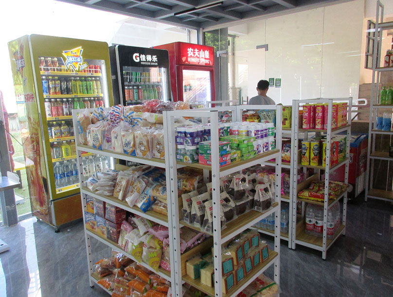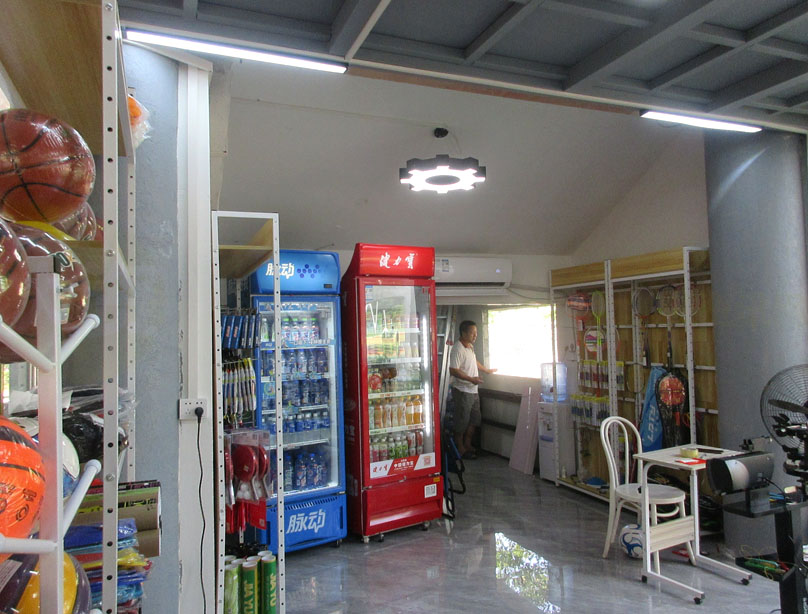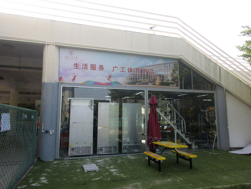 店面装修风格还是挺通透明亮的,至少是三面主外墙都是玻璃透明光亮,内部格局及商品摆放几乎都三面无死角清晰可见,这样的呈现也非常符合这个位置所在本身,应该是一种挺较为合适的装修选材及设计考究了,暂时还不是很了解所卖各商品类价格是否算贵或较为适中合理可接受,可能那几个冰箱卖饮料各种水饮品会比较畅销,因为就离着中心田径场最近几乎可算主出入口,进出一拐就是,直接拿直接给钱or扫码付款,不用像到那些自动售卖机里各种按各种扫操作,还要等又多数时候选品类单一或缺货