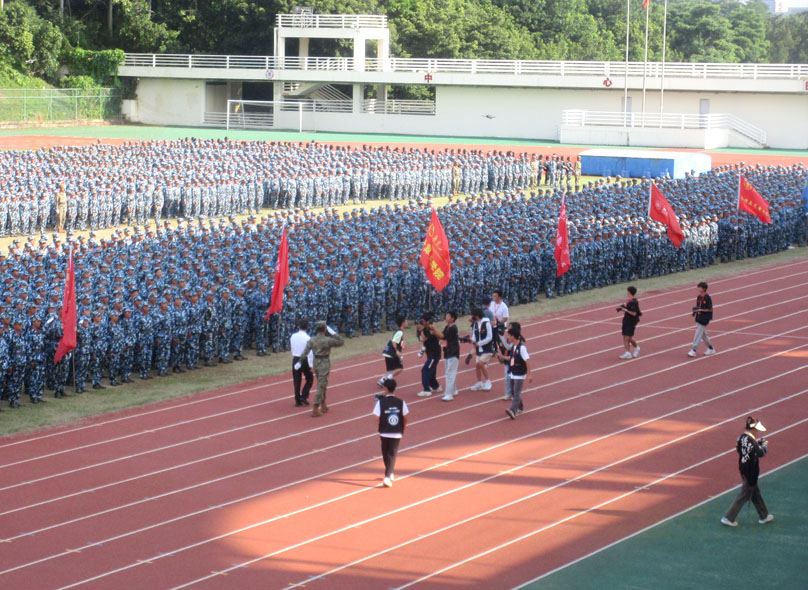 广东工业大学大学城校区2023级本科新生军训检阅总结大会今下午在教学区中心田径场展开进行