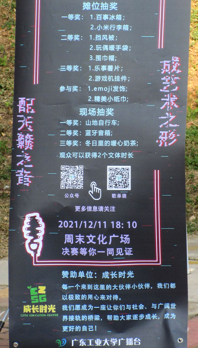 广工实时 广播台·赋声百态配音大赛决赛正在东区校道进行摊宣(现场互动玩游戏可抽奖,看着奖品好像还算挺丰厚)
