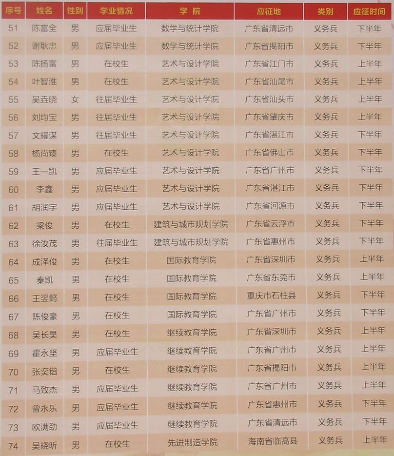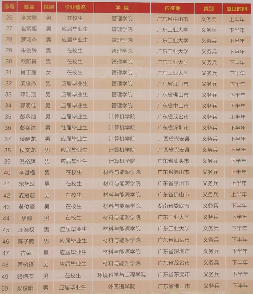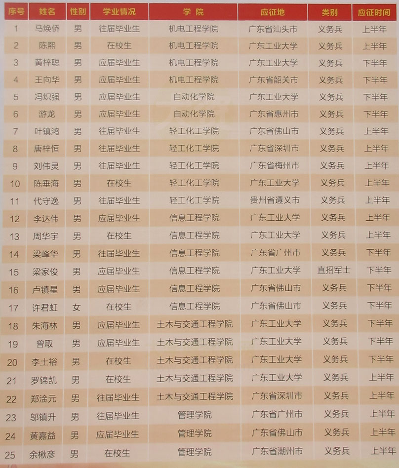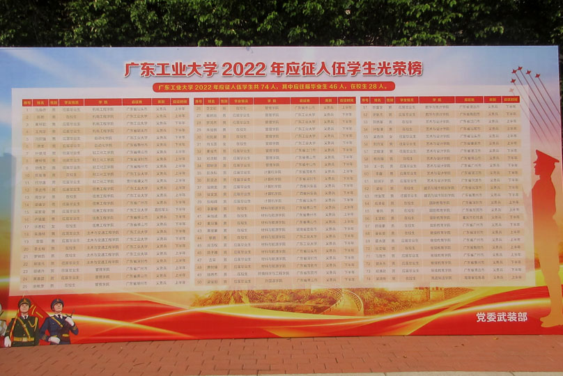 | 广东工业大学2022年应征入伍学生光荣榜 | ||||||
