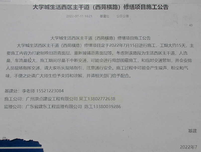 不止是三饭(一楼)要新升级装修翻新啊,西区横向主干道东门到西门整段将铺新沥青翻新,西区的校内道路应该也是自大学城建好后就没翻新改造过的,所以翻新一下也显得很必要,尤其这条东西向的主干道,下学期回来看到,校道路面是新的,饭堂估计也终于是新的,西区学生的生活指数也算赶上东区的同样标准了