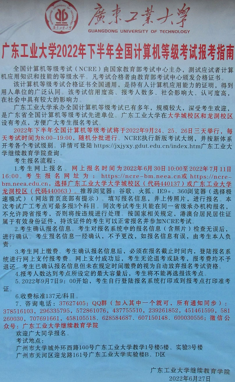 广东工业大学2022年下半年全国计算机等级考试报考指南 |