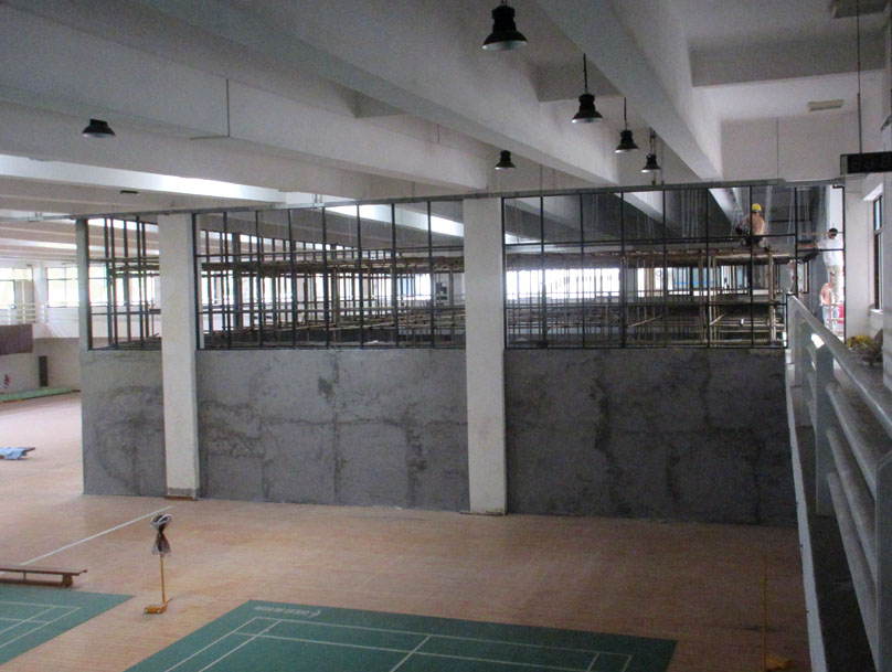 不知是要重新弄成一个怎样的效果或者说是做别的,目前看到在吊天花板,现场施工的也说不太清楚是做啥,是不是体育馆延伸的新办公室空间之类的
