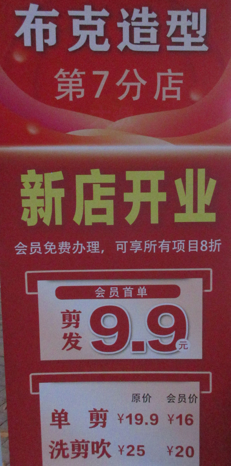 新店开业,一般都少不了一些福利和优惠,这里看到办理会员,会有打折,会员首次剪发是9.9或10元