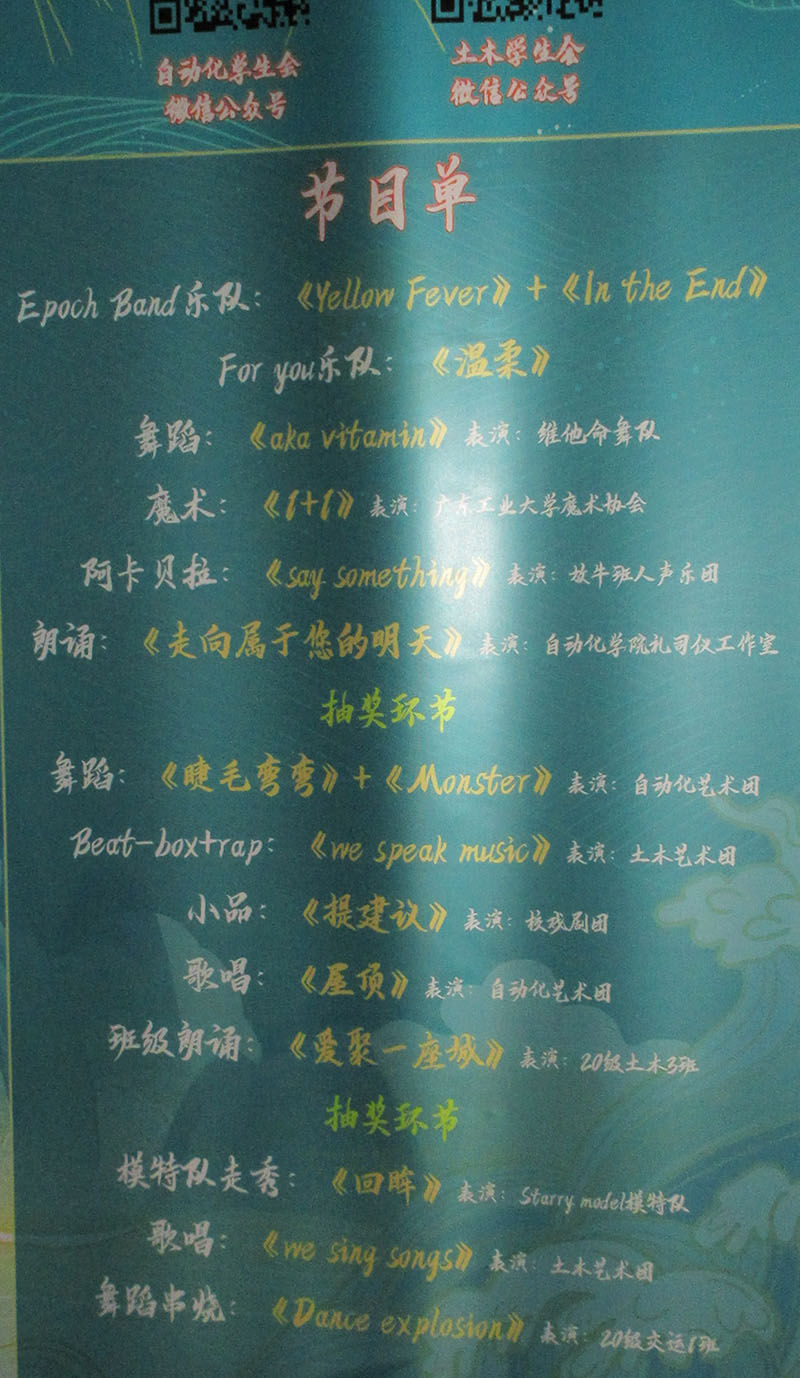 | 今晚自动化与土木学院联合迎新晚会节目单 | ||||||