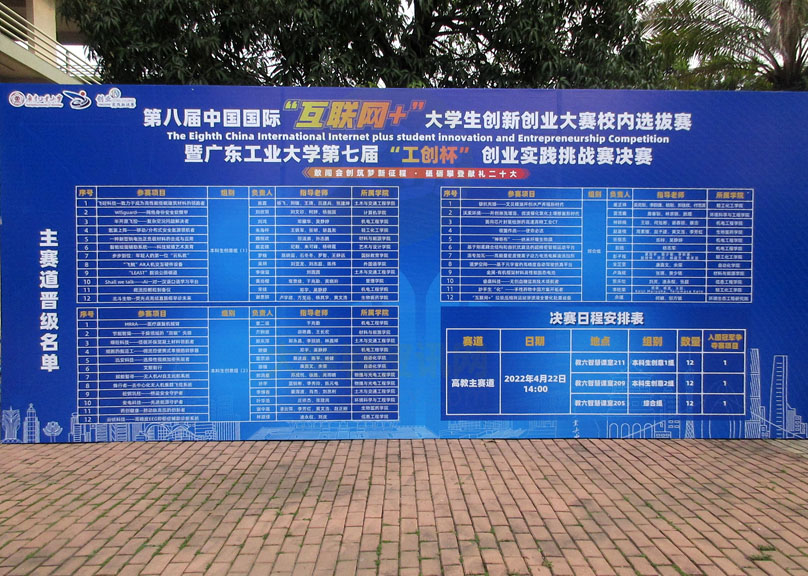 | 第八届中国国际“互联网+”大学生创新创业大赛(广工)校内选拔赛暨广东工业大学第七届“工创杯”创业实践挑战赛决赛 2022年4月22日下午14点开始 教六智慧课室 | ||||||
