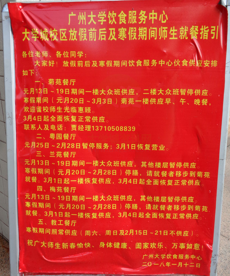 | 广州大学饮食服务中心大学城校区放假前后及寒假期间师生就餐指引 | ||||||