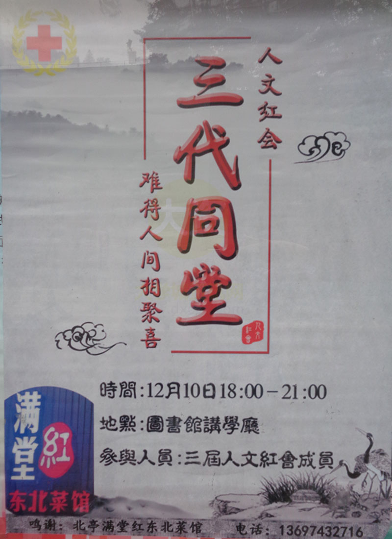 | 人文学院红十字会三代同堂聚会 12月10日18:00-21:00 图书馆讲学厅 | ||||||