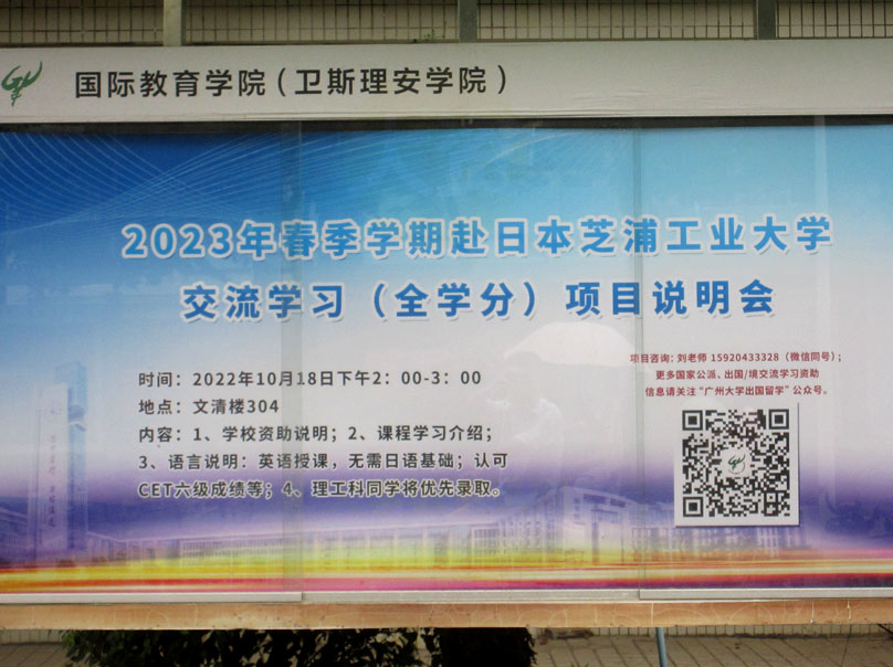 2023春季学期赴日本芝浦工业大学交流学习(全学分)项目说明会 2022.10.18下午2点-3点 文清楼304