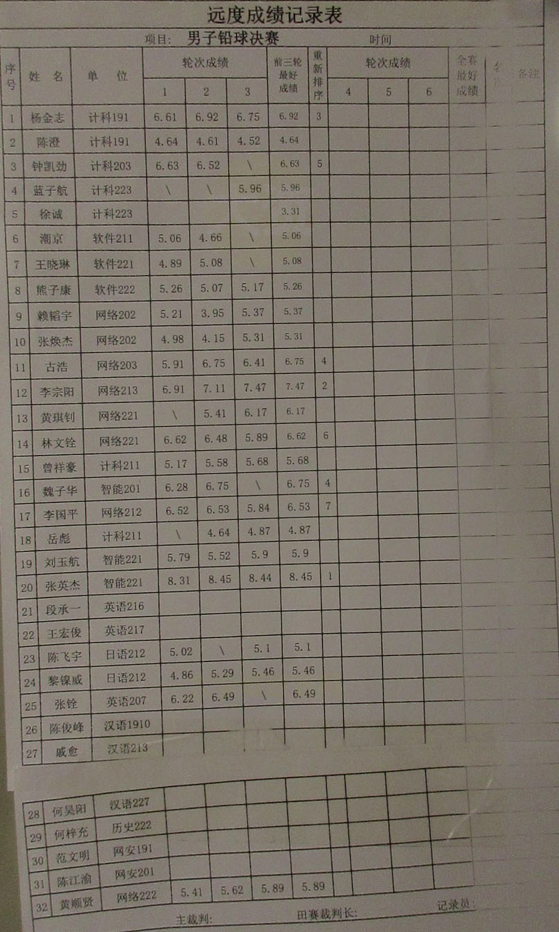 计算机、外国语、人文、网安四院联合运动会 男子铅球决赛-远度成绩记录表 |