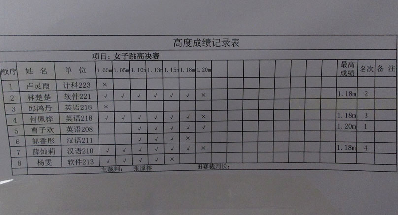 计算机、外国语、人文、网安四院联合运动会 女子跳高决赛-高度成绩记录表 第一名:曹子欢 高度1米20 英语208 第二名:林楚楚 高度1米18 软件221 第三名:何佩桦 高度1米18 英语218 第四名:薛灿莉 高度1米18 汉语210 |