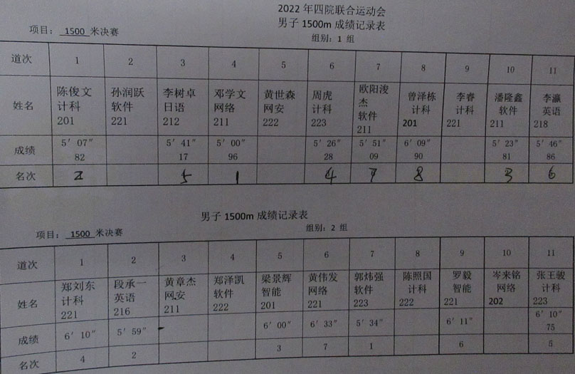 | 2022.10.22广大四院联合运动会 男子1500米决赛(2组)成绩记录表 | ||||||