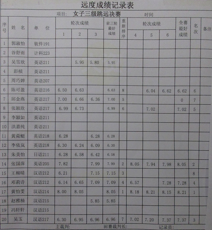 | 计算机、外国语、人文、网安四院联合运动会 女子三级跳远决赛-远度成绩记录表 | ||||||