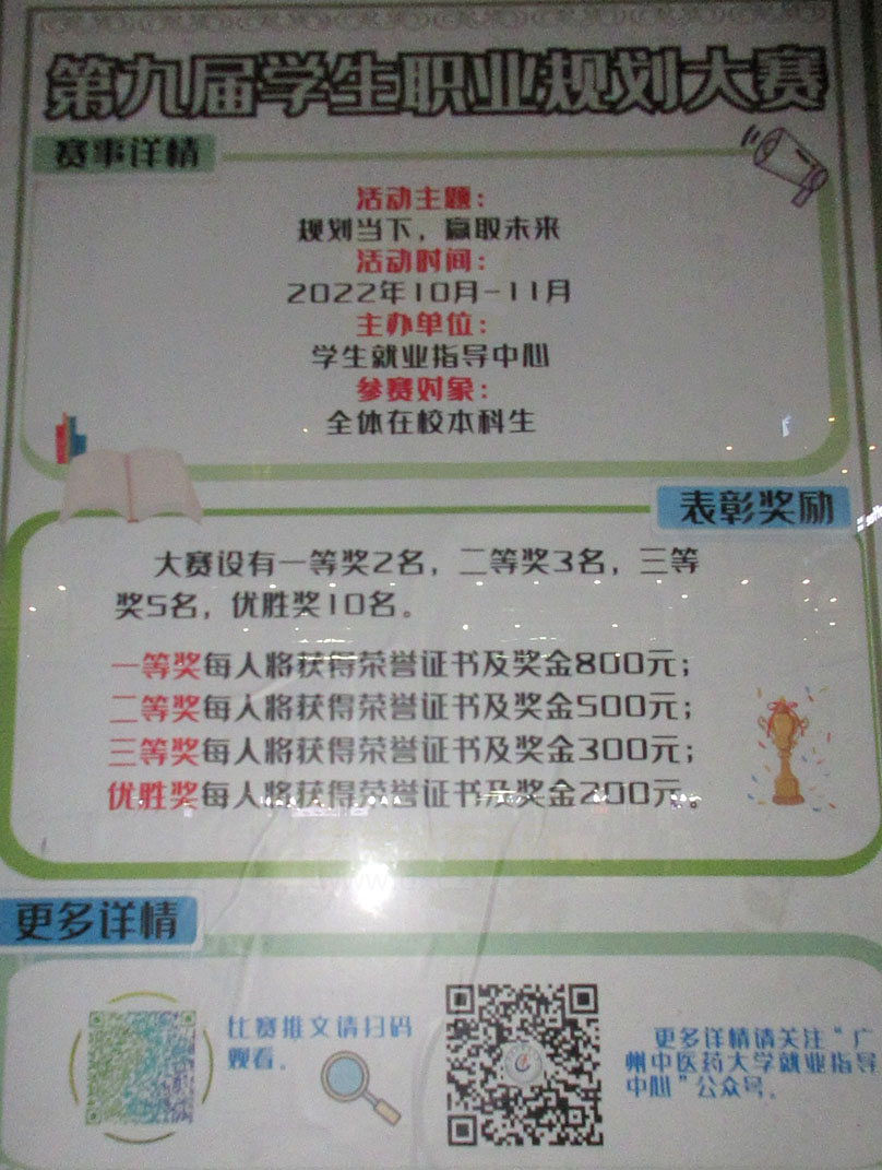 广中医-第九届学生职业规划大赛 2022.10月-11月 奖项设置:一等奖2名奖金800元,二等奖3名奖金500元,三等奖5名奖金300元,优胜奖10名奖金200元 |
