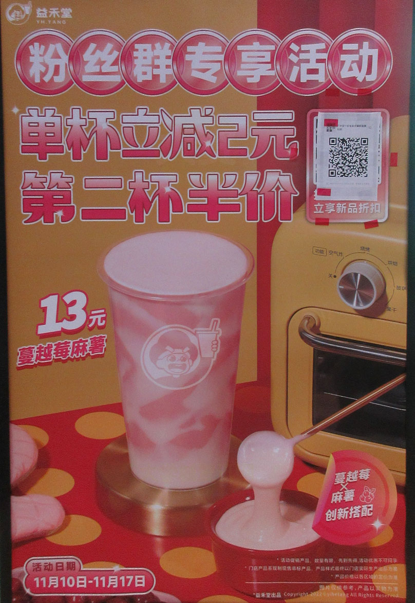 | 广中医生活区一饭一楼内西北角 益禾堂 粉丝群专享活动,单杯立减2元第二杯半价 时间11月10日-11月17日 创新搭配-蔓越莓麻薯13元 | ||||||